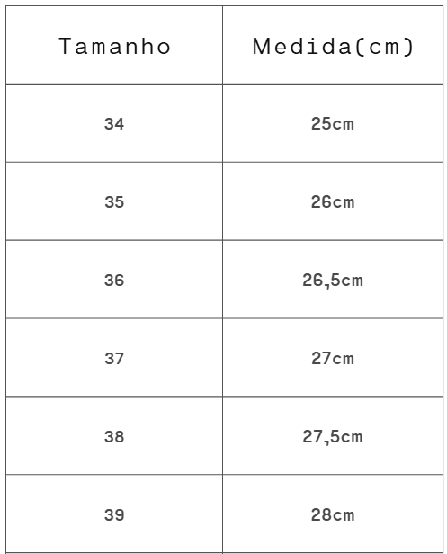 📏 Dica de tamanho: devido ao formato do bico, recomendamos escolher um número com 2 cm a menos conforme a tabela de medidas.